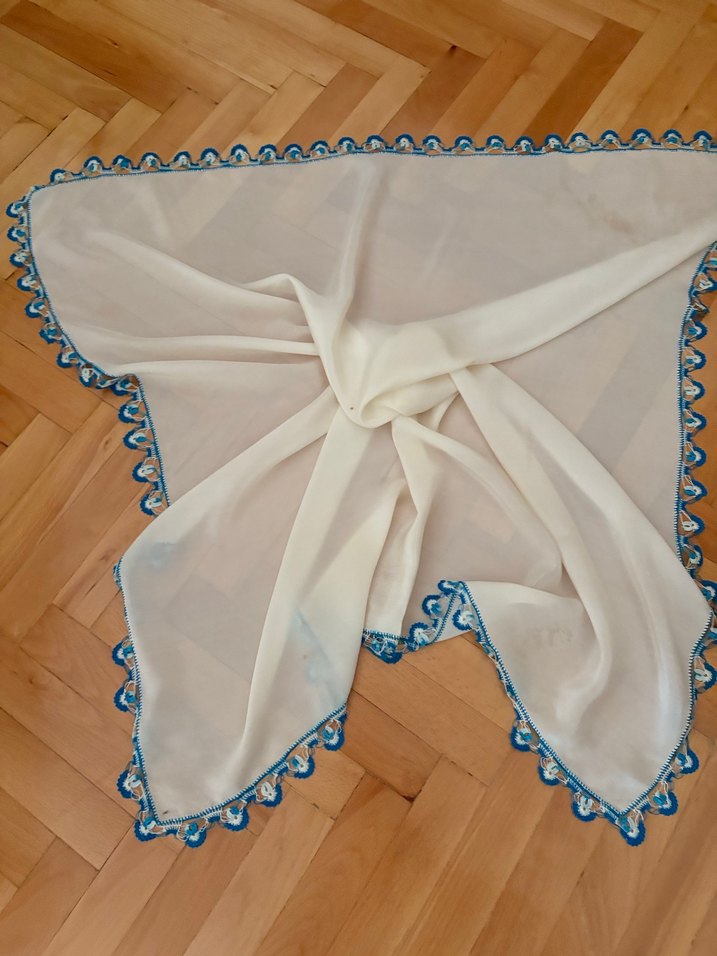Beyaz, ipek görünümlü dokusuyla, mavi detaylı kenarları olan, 90cm 90 cm birkaç ufak lekesi var yıkanınca çıkar hiç kullanılmad