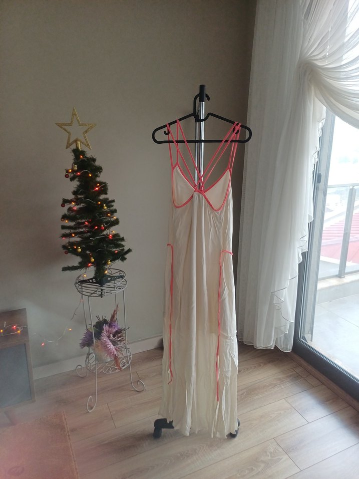 Beyaz, ipeksi kumaştan askılı, halter yakalı, drapeli ve bohem tarzda uzun, vücuda oturan elbise. Romantik geceler için uygun.
