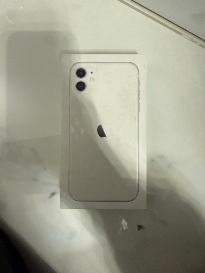 Çift arka kameralı ve Apple logosu bulunan beyaz iPhone 11 kutusu, açık renk bir zeminde.