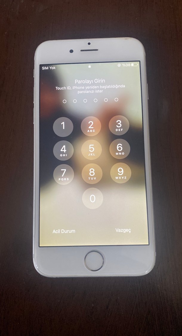 Beyaz renkli iPhone 6, kilit ekranında parola girişi için sayısal tuş takımı görünür. SIM kart yok uyarısı ve acil durum ile vazgeç seçenekleri mevcut.6s - 64 gb.