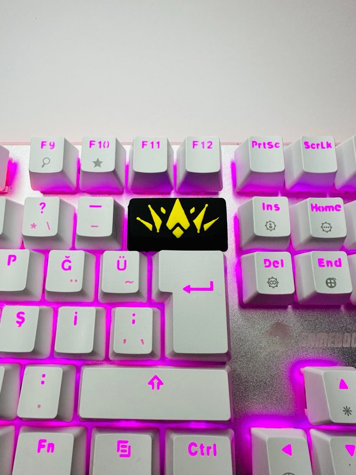 Beyaz renkli, açık pembe ışıklandırmalı gaming klavye. End, F11, F12, Ins, Del gibi fonksiyon tuşları ve Türkçe karakterler içerir.
