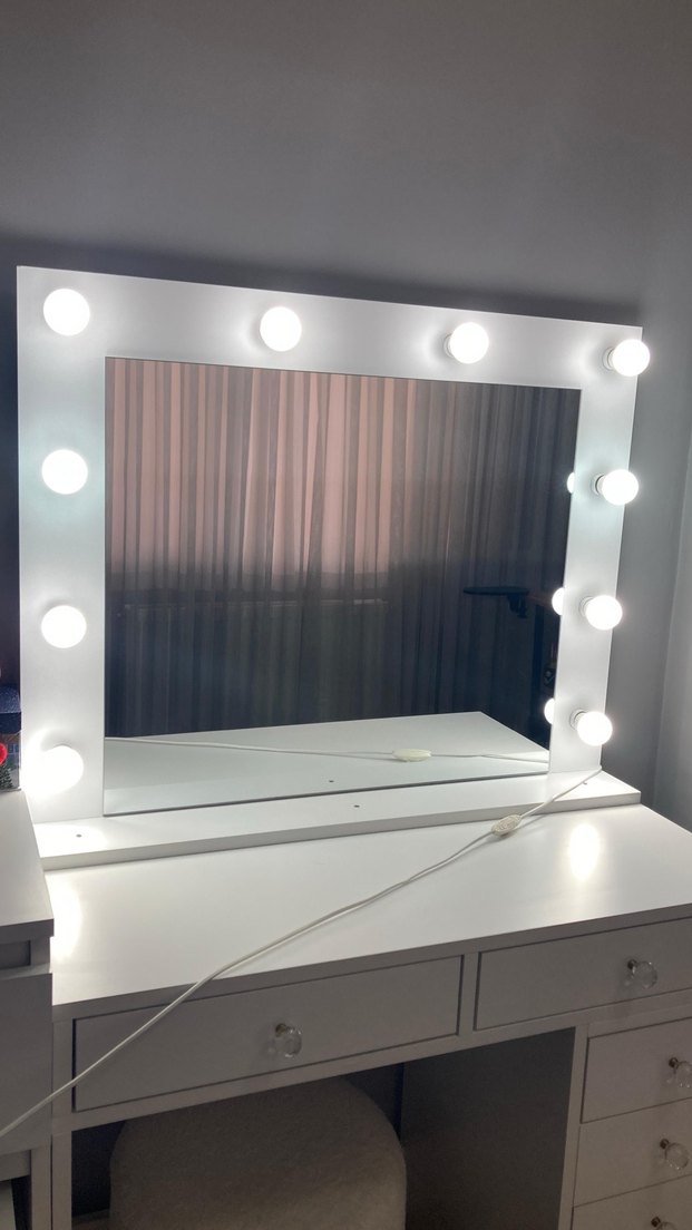 Çevresinde ışıklar bulunan beyaz makyaj aynası, net yansıma ve iyi görünürlük sağlar. Modern ve sade tasarıma sahiptir. Fotoğrafta görülen küçük deformasyon ürün bize ulaştığında mevcuttu. Gözünüze çok çarpmaz ancak yine de bilginiz olsun istedim. Bunun dışında ürün yeni gibidir.