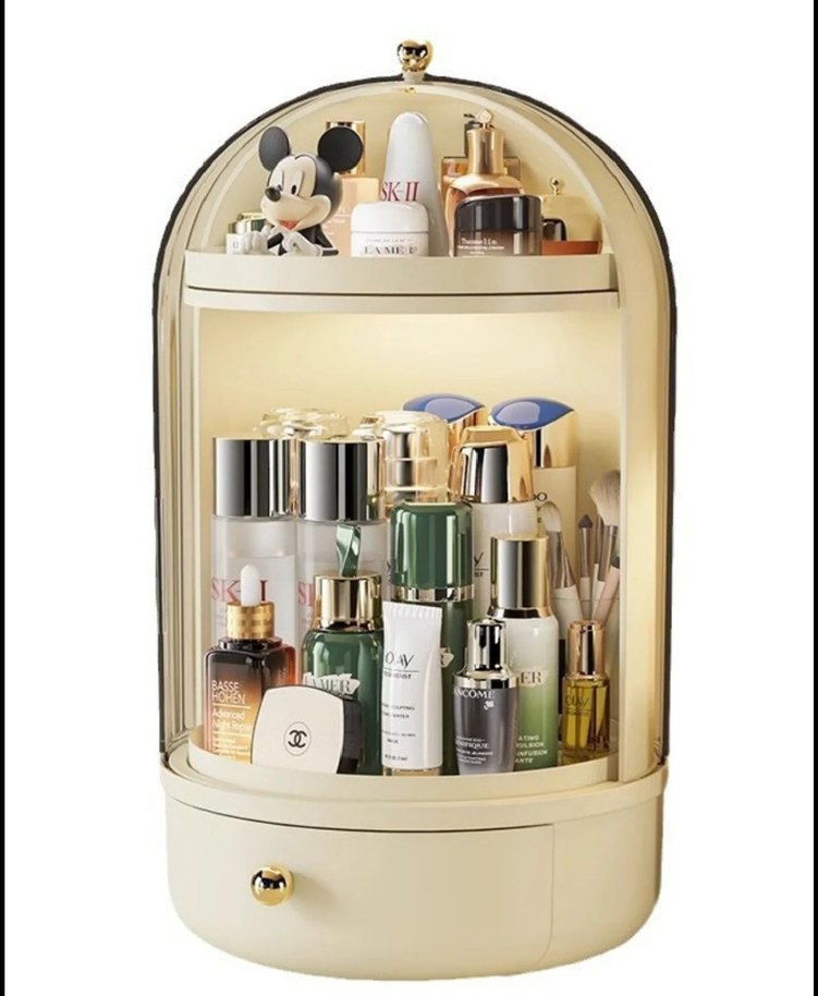 Beyaz renkte, ışıklı iç mekânı, çoklu rafları ve çekmecesi ile kozmetik ve cilt bakım ürünlerini düzenlemek için uygundur.