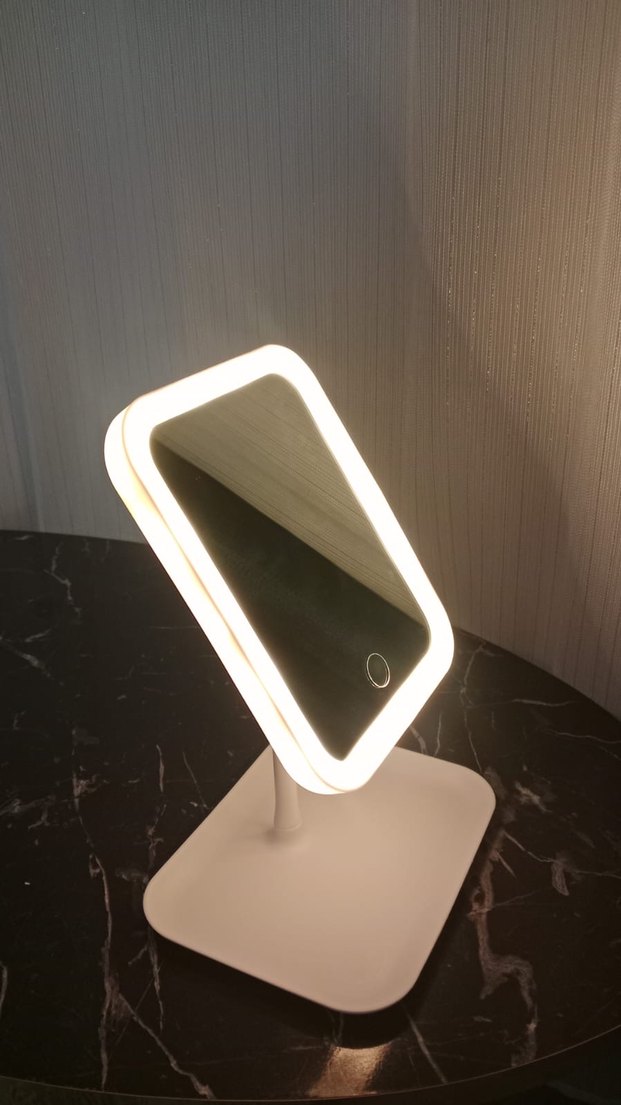 Beyaz renkli masaüstü makyaj aynası, kenarlarında ışık ve dokunmatik sensör ile kolay kullanım sağlar. Net yansıma ve aydınlatma sunar.