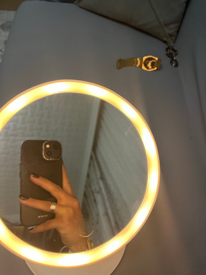 Beyaz çerçeveli, ışıklı yuvarlak makyaj aynası, detaylı makyaj için net ve parlak yansıma sağlar.