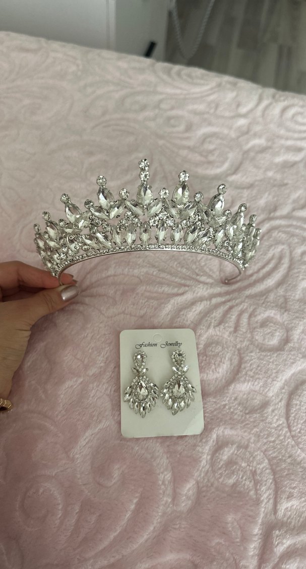 Beyaz ışıltılı gelin tacı ve uyumlu küpelerden oluşan, modern klasik tarzda şık ve göz alıcı bir set. ✨ gelin tacı 1 kere kullanıldı küpe hiç kullanılmadı
