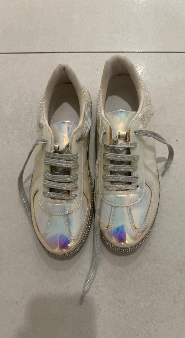 Beyaz, ışıltılı kadın spor ayakkabısı, payet detaylı ve parlak yüzeyli, kauçuk tabanlı, sokak stili için uygun. Hiç giyilmedi