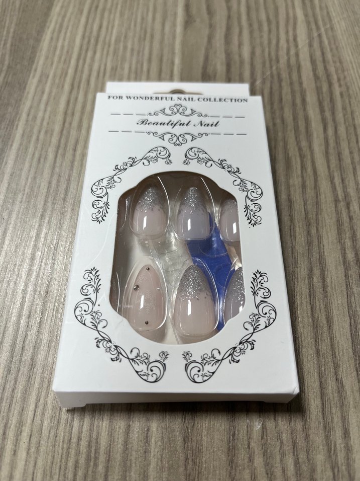Beyaz renkli, hafif ışıltılı ve küçük süslemeler içeren takma tırnak seti. Wonderful Nail Collection ürünüdür. 24 adet tırnak 24 adet yapıştırıcı bir adet Törpü