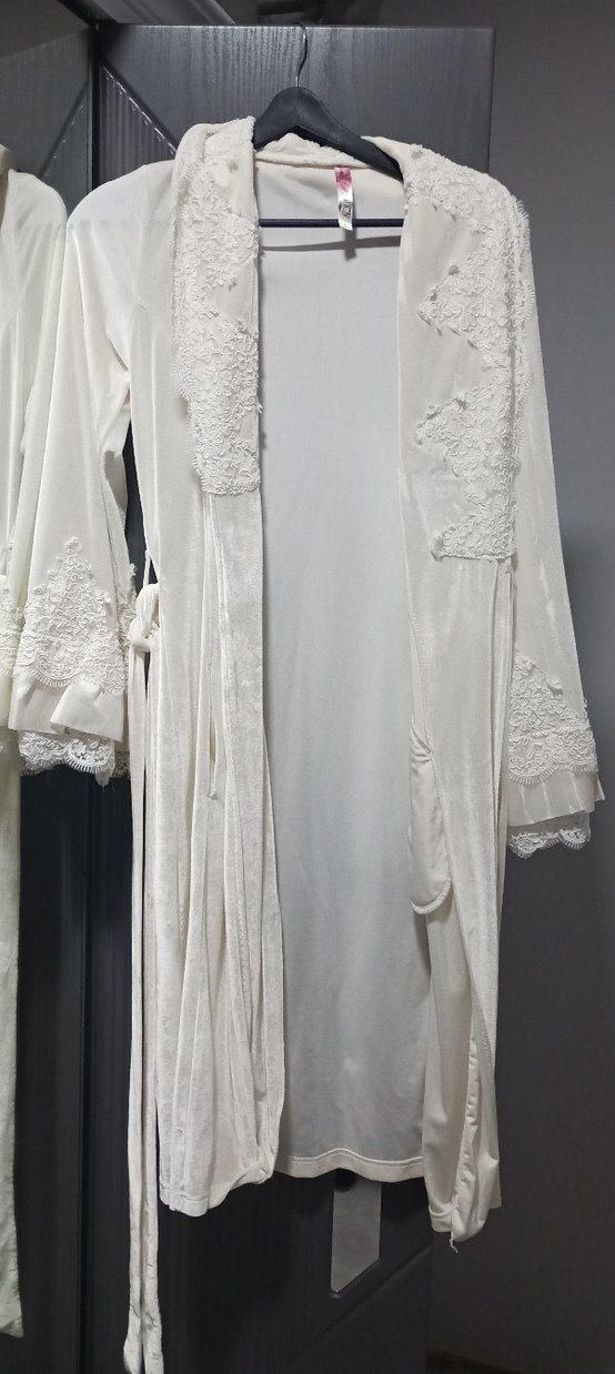 Beyaz, uzun kollu ve bol kesim bohem tarzı kadın sabahlık. Kollar ve ön kısımlarda işlemeli dantel detayları bulunur. Hafif ve şık bir görünüme sahiptir.