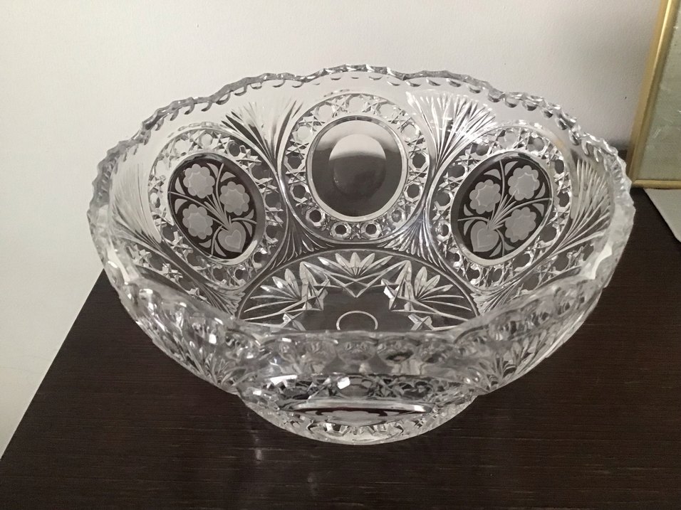 Çiçek ve geometrik desenli beyaz Bohemia kristal vazo, dalgalı kenar detayına sahip. Zarif ve detaylı tasarım.