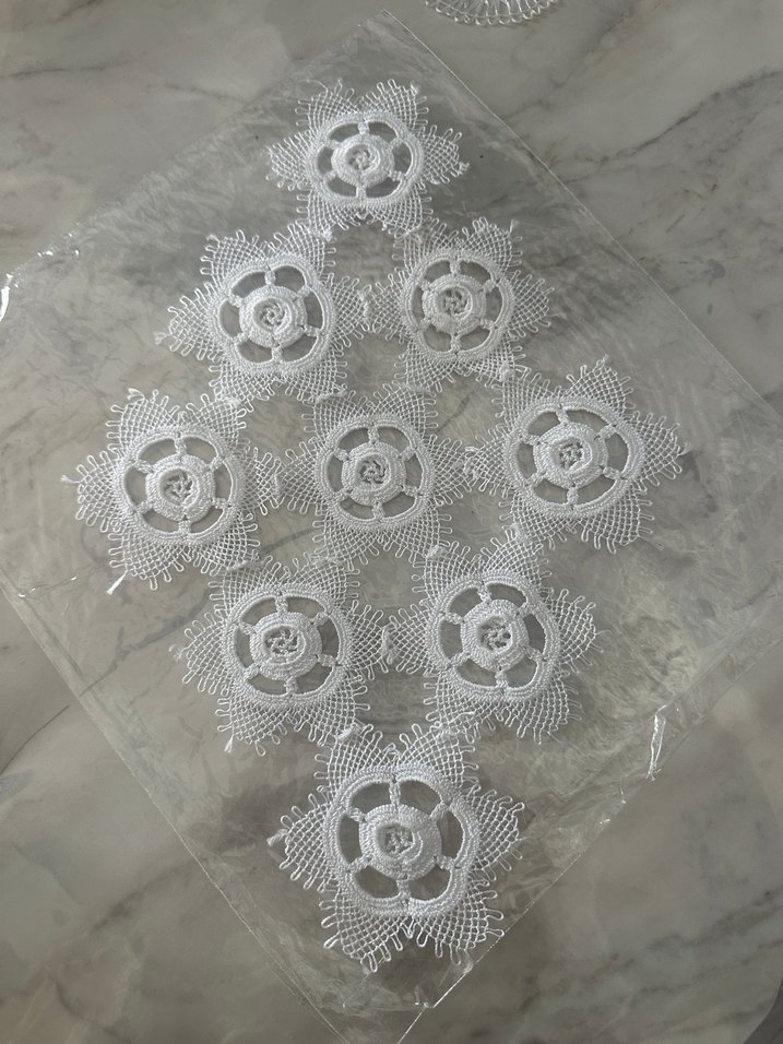 Detaylı çiçek işlemeleriyle beyaz dantel örtü, dekoratif kullanım için uygundur.