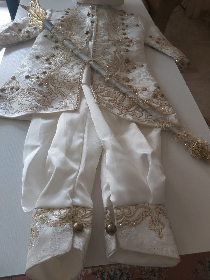 Beyaz, işlemeli, uzun kollu çocuk takımıdır. İpek gibi kumaştan, drapeli ve klasik şıklıkta, yakası kesimli ve dar kesimdir. ✨ 6 parçadan oluşur Uzun yemeni Gömlek Pantolon Kemer Fes Asa Hiç giyilmedi