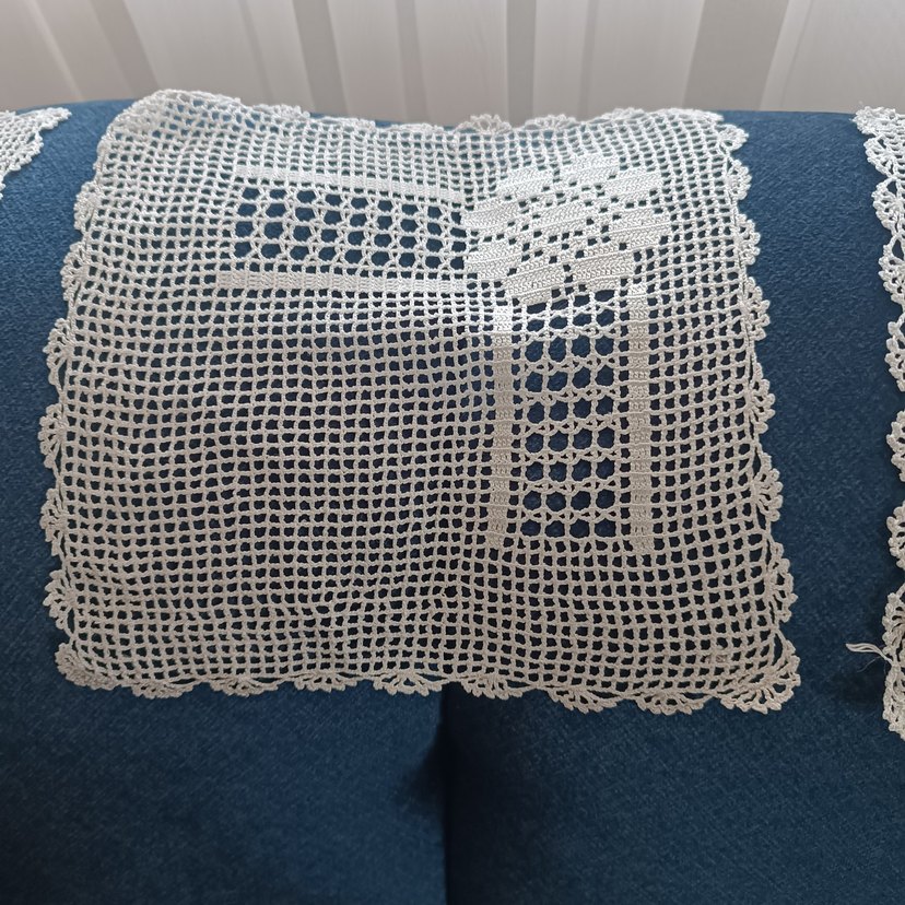 Beyaz işlemeli el işi dantel örtü, ince ızgara deseni ve zarif açık işçilikle, etrafı dalgalı kenarlıklıdır. Dekoratif kullanım için uygundur.