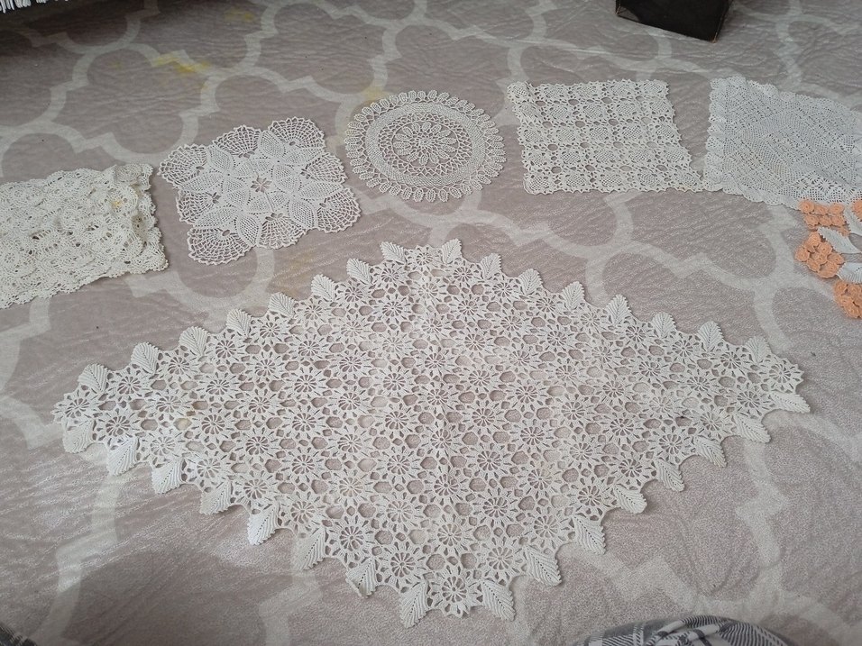 biri büyük diğer 8'i kare ve Yuvarlak olmak üzere 9 adet farklı modellerde dantel Çeşitli şekil ve boyutlarda geleneksel beyaz işlemeli el yapımı dantel seti, dekorunuza klasik bir dokunuş katar.