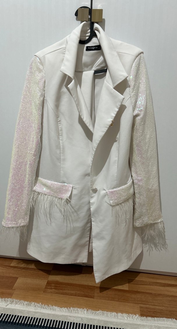 Düğmeli, işlemeli kolları ve püskül detaylı cepleri olan beyaz, uzun kesim kadın blazer ceket. Sentetik kumaştan, regular fit ve şık sokak stili için uygun. Pantolonu beyaz düz bol paça ✨ bir kez giydim nikahta 40 bedenede uyumlu