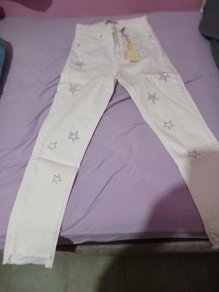 Beyaz midi uzunlukta, işlemeli yıldız desenli ve payet detaylı kadın jean pantolon. Yumuşak sentetik kumaştan, rahat kesim ve günlük sokak stili için uygun. stres beyaz etiketli hiç kullanılmamış bel 30 toplam bel 60 santim A'dan bele kadar olan uzunluk 27 tüm boy 8 6 en kısa yeri en uzun yeri 89 paçalar farklı model kot pantolon en altta Bir yıldızın taşı düşmüş görebilirsiniz resimde en alttaki yıldıza bakın