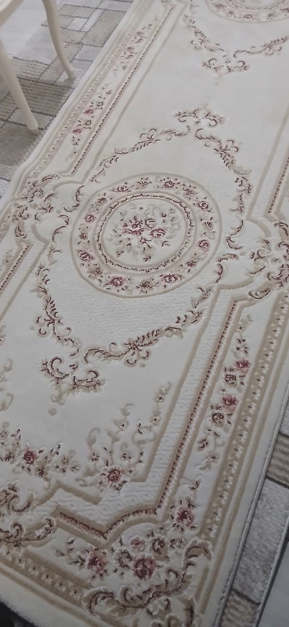 Beyaz renkli, işlemeli çiçek desenlerine sahip klasik tarzda hafif görünümlü halı. Tasarımında 'F' harfi yer alır.