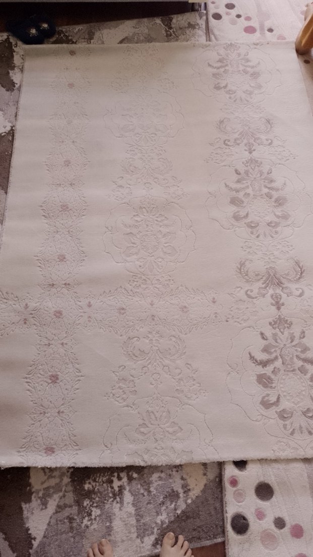Beyaz renkte, hafif işlemeli desene sahip modern klasik tarzda bir halıdır. boy 188 en 132