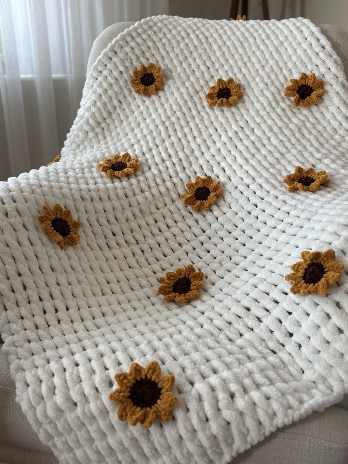 Beyaz örgü çocuk battaniyesi, kahverengi ve sarı tonlarda işlenmiş ayçiçeği desenleriyle sıcak ve dekoratif bir görünüm sunar. 120x120