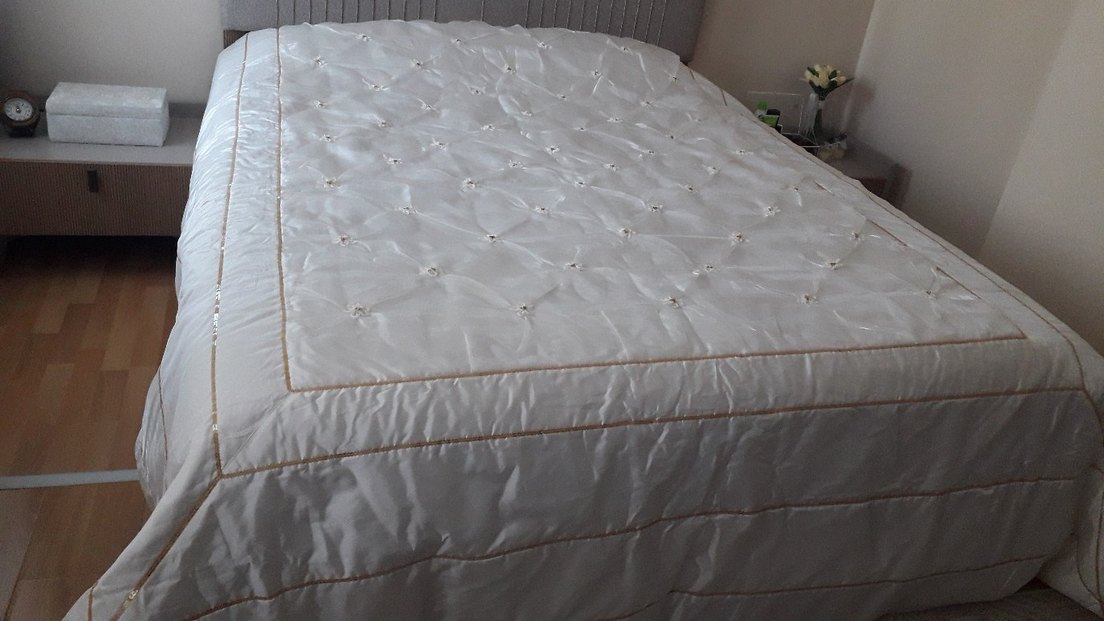 yatak örtüsü takımı.Hic kullanilmadi ütülerken arkasinda yanik izi oluştu ama serilince görünmüyor arkada kalıyor.