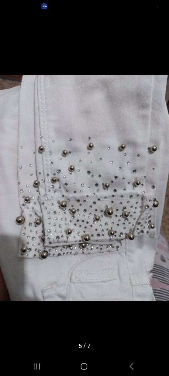 Sentetik kumaştan yapılmış, işlemeli ve payetli detaylara sahip beyaz, dar kesim kadın pantolon. Midi boy, sokak modasına uygun. ✨