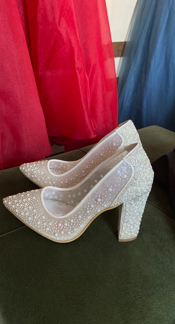 Beyaz işlemeli ve payetli detaylara sahip, modern klasik tarzda yüksek topuklu kadın ayakkabısı, düğünler için hafif ve şık tasarım.