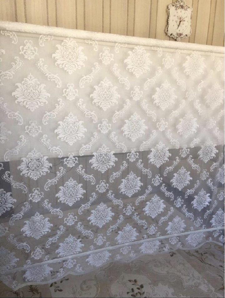 Beyaz renkli, işlemeli desenlere sahip klasik tarzda perde. Hafif kumaşıyla mekana zarif bir dokunuş sağlar ürün sağlam hiçbir sorunu yok Ölçüleri: En:180 cm Boy:2 metre
