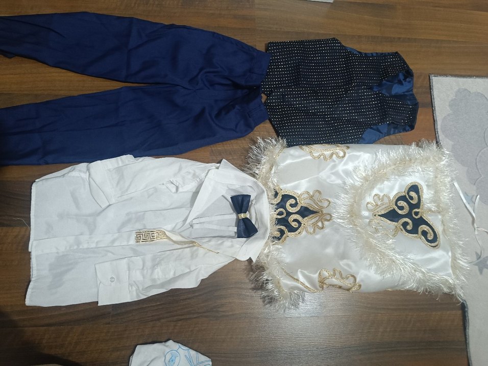 Beyaz işlemeli ve pullu, kolsuz ceketi, lacivert pantolon ve papyonlu beyaz gömleğiyle uyumlu, kesimi dar çocuk takımı. Ceket yakası kesik ve parlak görünümde.✨