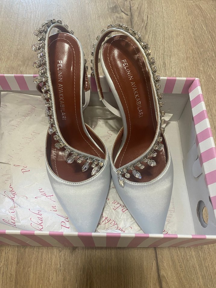 Beyaz saten, işlemeli ve payet detaylı yüksek topuklu kadın abiye ayakkabısı, düğün ve özel günler için uygundur.