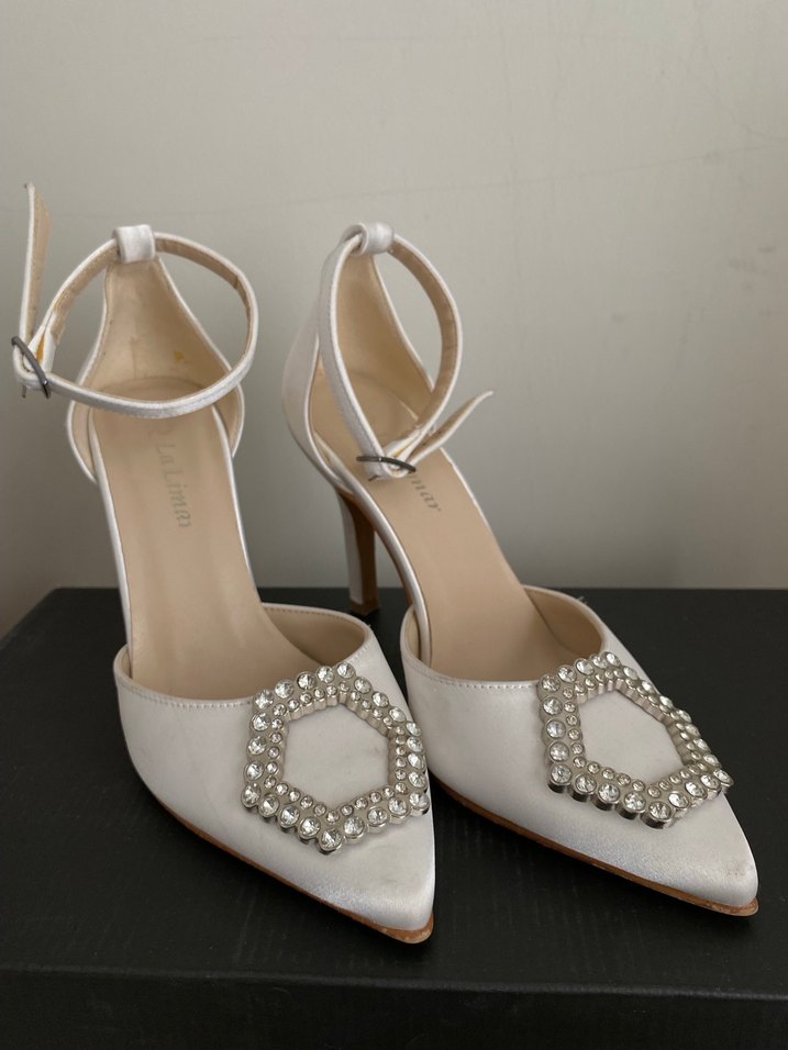 İşlemeli detaylara ve tokalı bilek kayışına sahip beyaz saten stiletto topuklu kadın ayakkabısı, düğünler için uygundur. Nikahında kullandım temiz durumda.