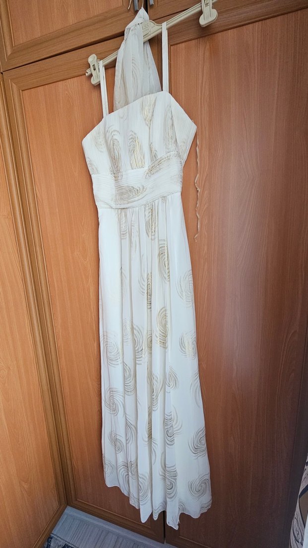 Beyaz işlemeli, straplez ve drapeli uzun abiye elbise. Kolsuz, bohem tarzda, düzenli kesim, düğün için uygundur.