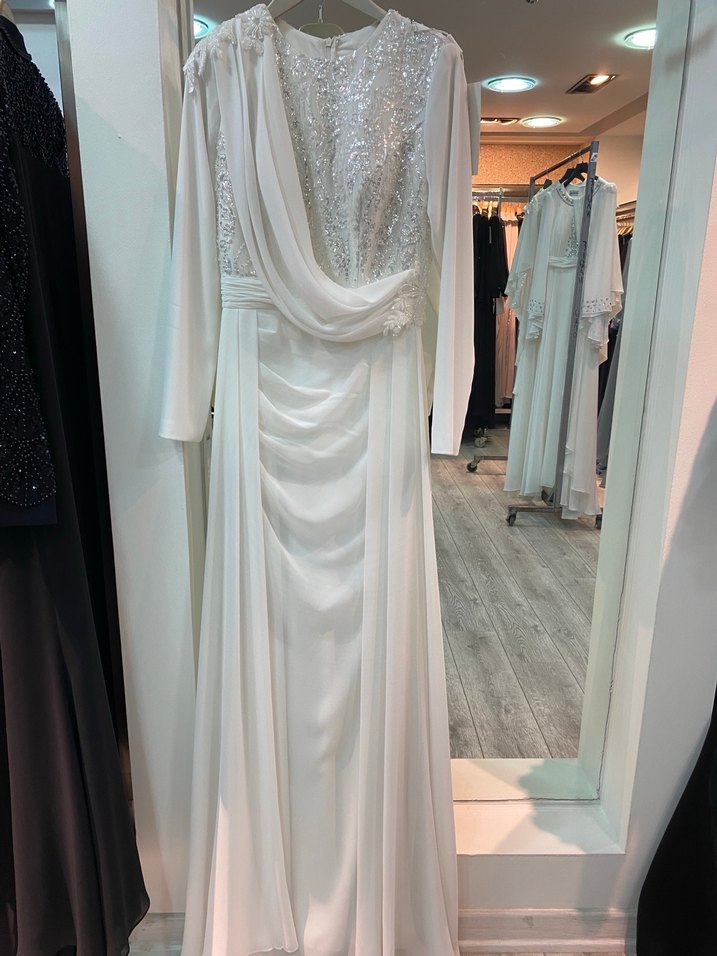 Beyaz renkli, işlemeli ve drapeli uzun abiye elbise, V yaka ve uzun kolludur. Düğünler için modern klasik tarzda, rahat kesimdir. ✨
