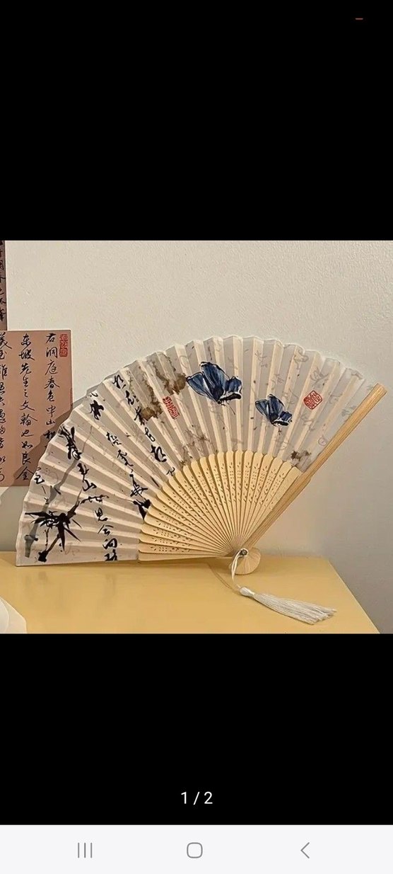 Ahşap saplı, beyaz üzerine kelebek ve kaligrafi desenli Japon katlanır yelpaze.