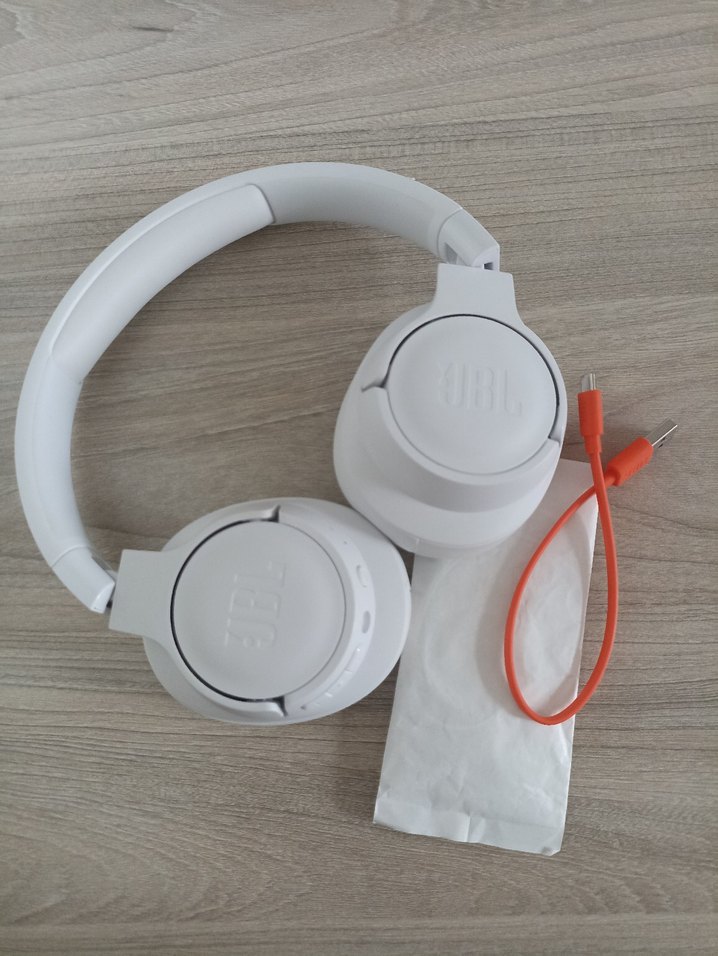 Yumuşak pedli kulaklıklar ve ayarlanabilir kafa bandıyla beyaz JBL kablosuz kulaklık. Turuncu şarj kablosu ile birlikte.