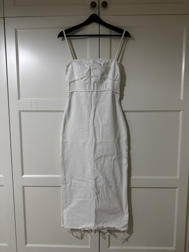 Askılı, straplez görünümlü beyaz jean kumaştan, midi boyda, vücuda oturan elbise. Günlük kullanım için rahat ve şık bir tercih. Yalnızca 1 defa giyildi