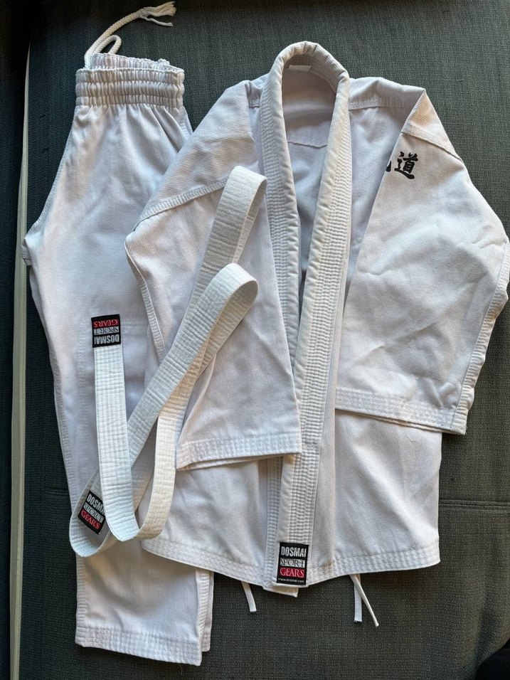 Dövüş sporu takımı erkek ve kız çocukları için kıyafet. Pantolon, gömlek ve kuşak dahildir. Sağlam dikişli yüksek kaliteli malzemelerden oluşur. Böylece çok sayıda antrenman ve sık yıkamadan sonra bile şeklini korur. Çok iyi durumda yeni gibi. Boy 140 cm. 8-10 yaş uygundur