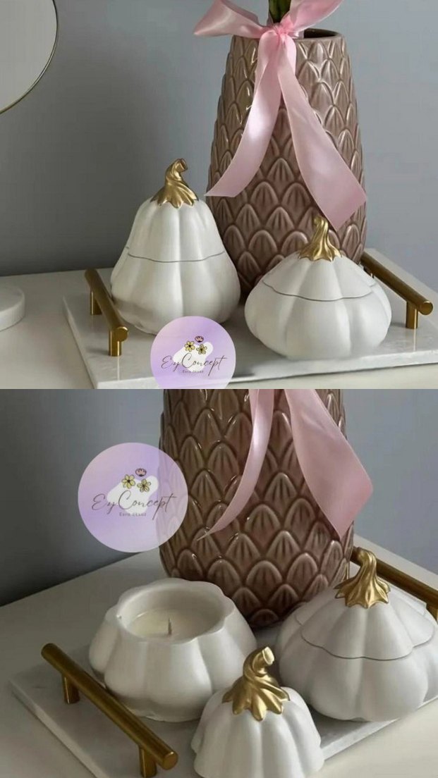 Altın renkli üst kısımlara sahip beyaz kabak şekilli mumluk seti, dekorunuza şıklık katmak için ideal.