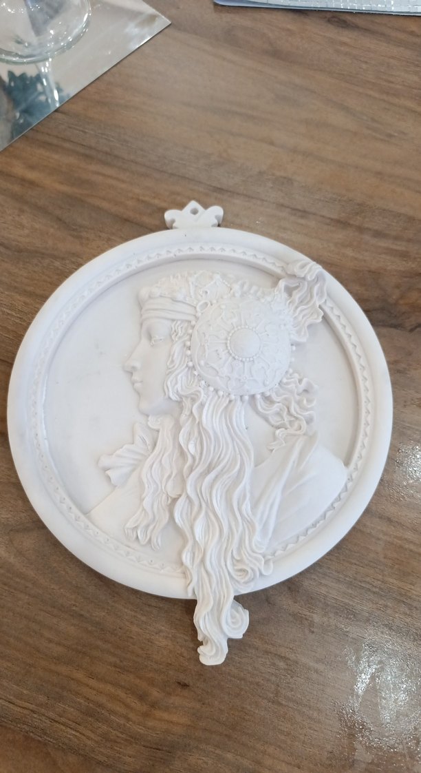 Beyaz renkte, kabartma kadın figürü detaylı saç ve süslemeleriyle duvarda şık bir dekoratif parça olarak kullanılır. ️