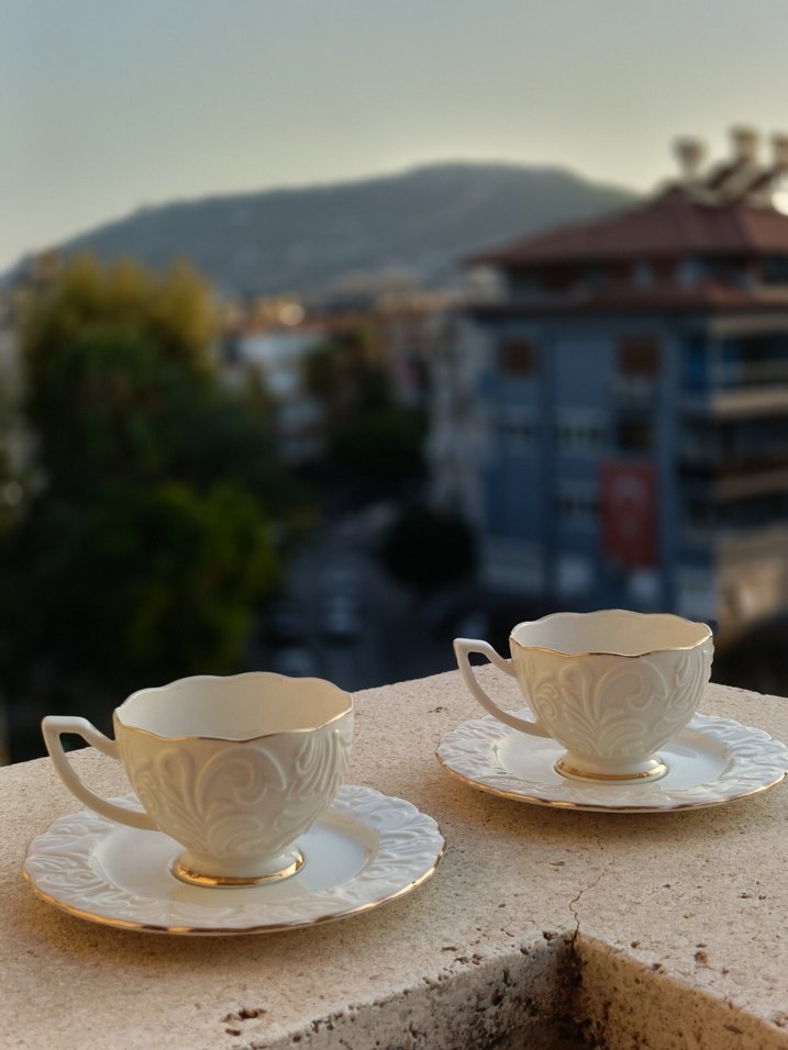 Kabartmalı desenlere sahip beyaz iki adet Türk kahve fincan ve tabağı içeren klasik tasarım seti. ☕