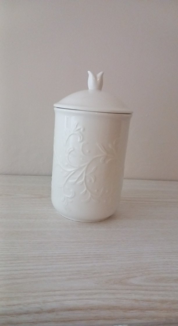 Kabartmalı çiçek desenli, kapağı olan beyaz kavanoz. Hafif ve zarif görünüme sahiptir.