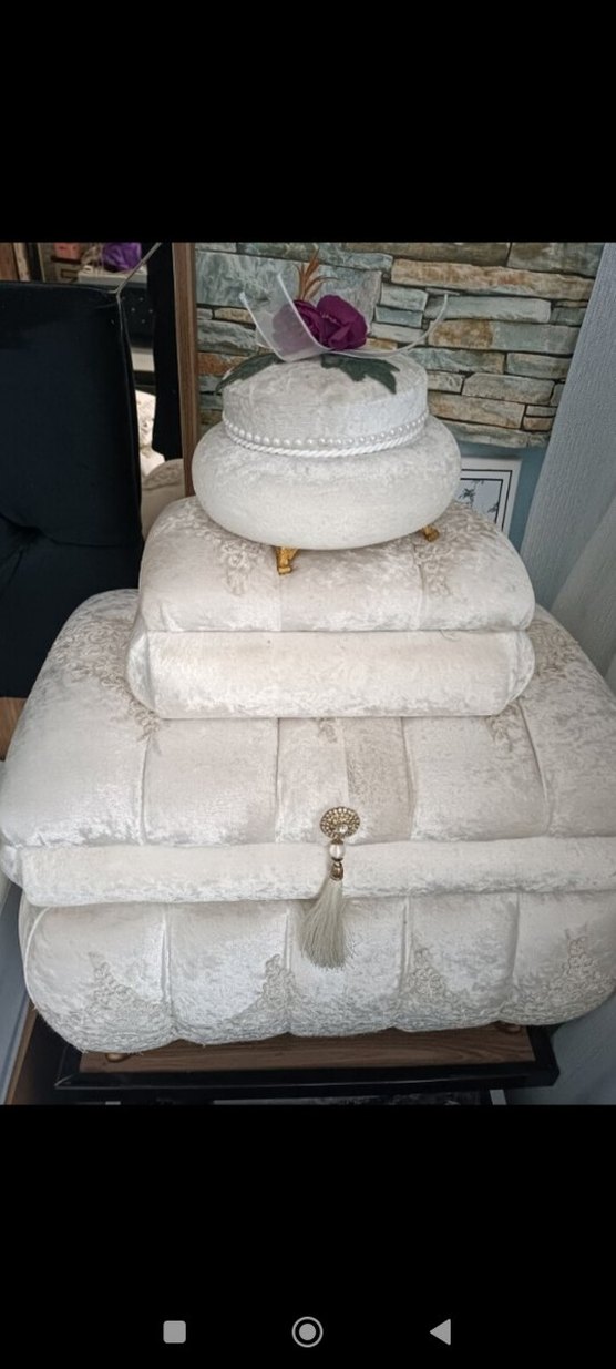 Kabartmalı beyaz ve gri tonlarında, puffed dokulu kumaştan oluşan klasik ve rahat tarza sahip düğün aksesuar seti. Zarif nakış ve süslü püsküller içerir.