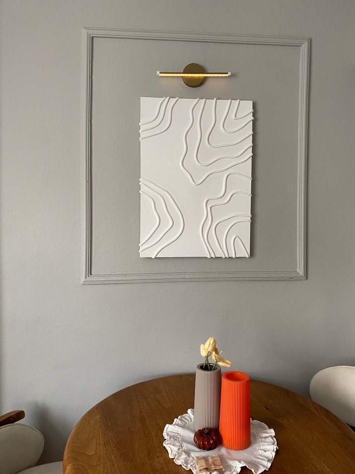 Bu beyaz duvar tablosu, soyut kabartmalı desenlere sahip modern bir tasarım sunar. Gri duvarda şık bir sanat dokunuşu sağlar. 50*70