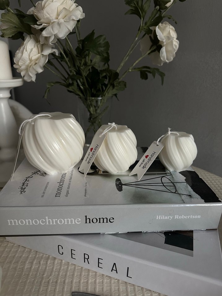 Kabartmalı, beyaz renkte üç boy mum seti, tamamı vegan doğaldır