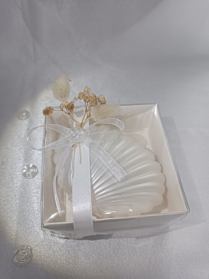 Kabartmalı beyaz mum, şeffaf kutu içinde beyaz kurdele ve kuru çiçek süslemeli, hediye için uygun