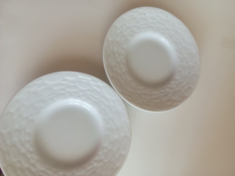 Yüzeyinde kabartmalı desen bulunan beyaz porselen kahve fiincanı tabaklar.iki adet Pürüzsüz yüzeyli ve hafif şık görünümlü. ️