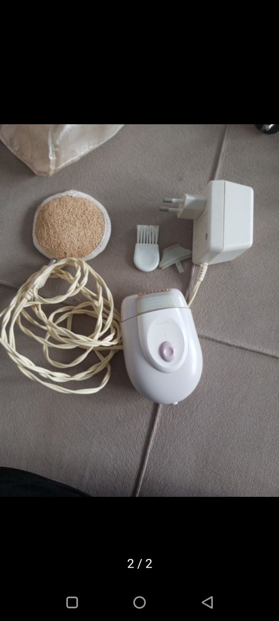 Güç adaptörü, temizleme fırçası ve peeling pedi ile beyaz epilatör. Kompakt ve kullanımı kolay, tüy alma için uygundur. ⚪