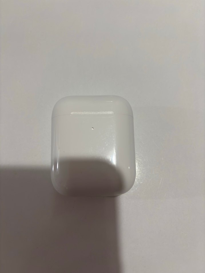 Beyaz, parlak yüzeyli kablosuz kulaklık şarj kutusu. Kompakt tasarımıyla taşımaya uygun.
