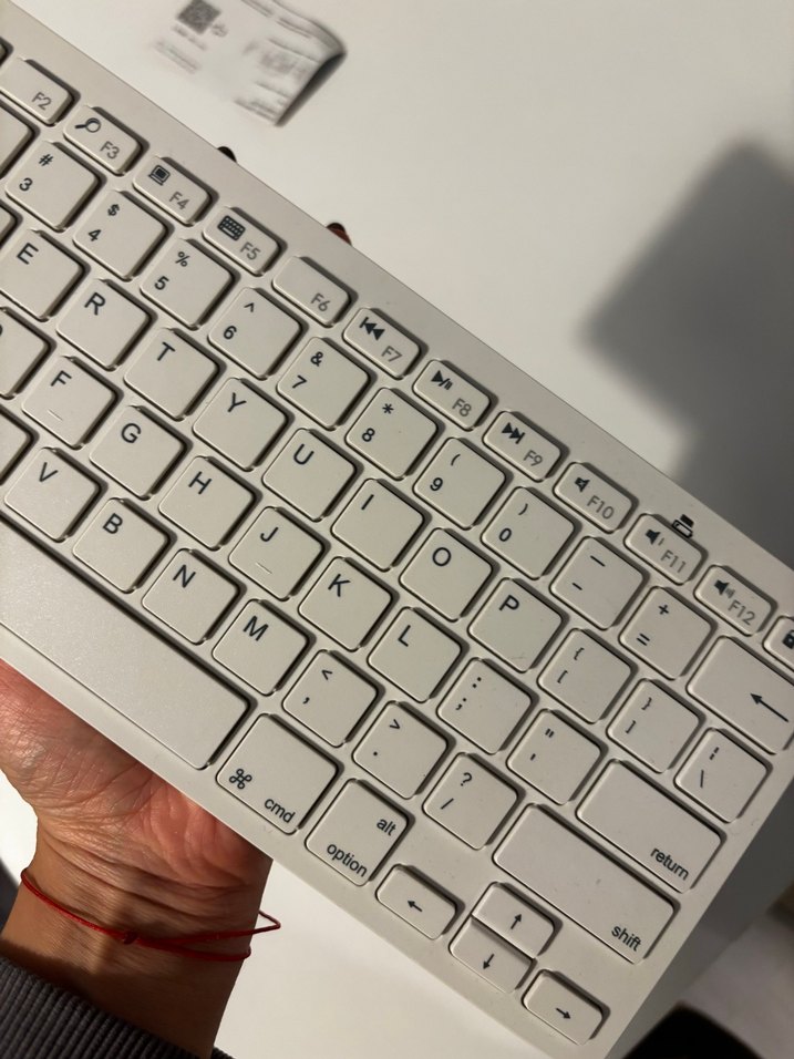 Hafif renkli tuşlara sahip beyaz kablosuz klavye. Fonksiyon tuşları ve medya kontrolleri içerir. Mac için komut ve seçenek tuşları mevcut. ⌨️ Ideal durumda. Pil ile çalisiyor.