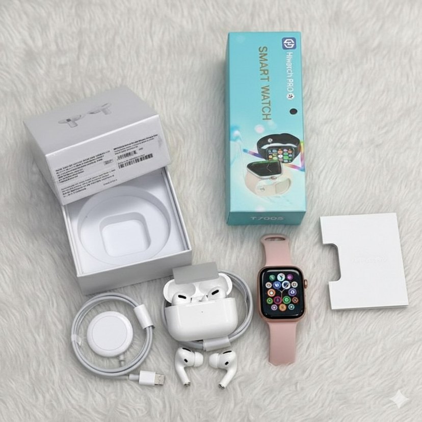Beyaz kablosuz kulaklıklar ve şarj kutusu ile birlikte pembe kayışlı renkli ekranlı akıllı saat seti. Şarj kablosu da dahildir. ⌚iki ürün tüm telefonlara uyumludur