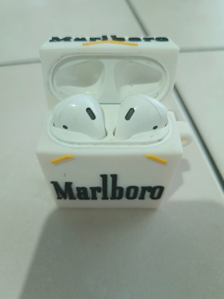 Renkli Marlboro yazılı, beyaz kablosuz kulaklık koruyucu kılıf. Kompakt ve taşınabilir tasarım . çok kaliteli Kulaklık satılık değildir